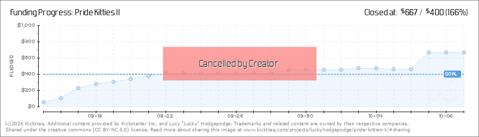 Hello all, I come bearing bad news. For reasons I will detail below, Pride Kitties II will be canceled. You will not be charged for your pledge, but I appreciate all the support this project has seen. I wish I could bring it to a reality. The... (Read More)