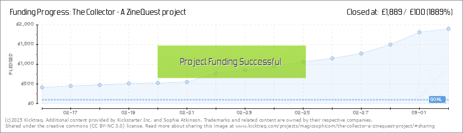 We're fully funded! Good news! The Collector will be coming to you in physical form in a printed zine. I'm so excited! Thank you so much to everyone who has backed already for helping to make my little game a physical reality. Now let's see if we can... (Read More)