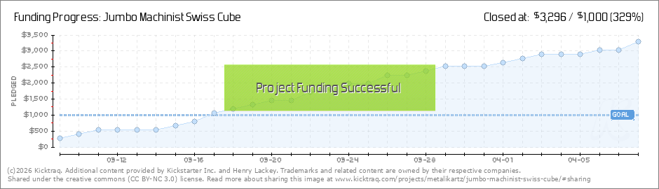 Hello everyone. I wanted to thank all of you for your support with the Machinist Swiss Cube campaign. Production should begin within the next few weeks and we are looking forward to shipping these awesome cubes to you! (Read More)