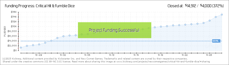 That's Right, We Funded in 5 days. We still have 4 weeks to go and the sky is the limit. We can start talking about details and possible stretch goals, now that we are funded, but for now, lets just all do a small dance as Crit-Fumble Dice will be a... (Read More)