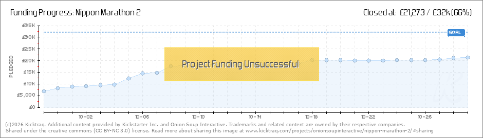 Hello everyone. Project Update As you can probably tell, it's unlikely that Nippon Marathon 2 will hit its minimum funding target. We're upset with how the Kickstarter has gone, and have spent numerous hours trying to turn it around with no success.... (Read More)