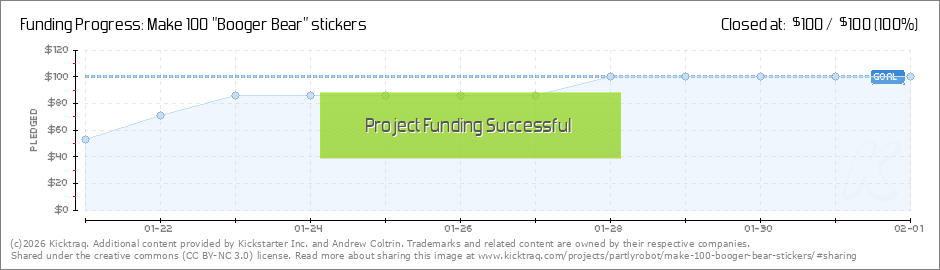 We've hit the funding goal for this Booger Bear Project. The stickers are going to be a go! There's still a couple days left to get in on the campaign and get those sweet, sweet backer rewards. Tell your friends! (Read More)
