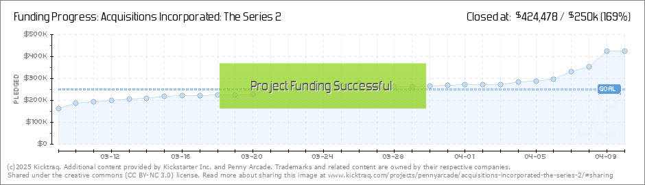 Penny Arcade's Kickstarter for Acquisitions Incorporated: The Series 2 has come to a close, as the company secured over $400k in funding. The company basically decided they were going to hit the reset button on their popular D&D live show and podcast, as they will start anew with a brand new setup, the return of both DM's, and a new story for you to enjoy. (Read More)