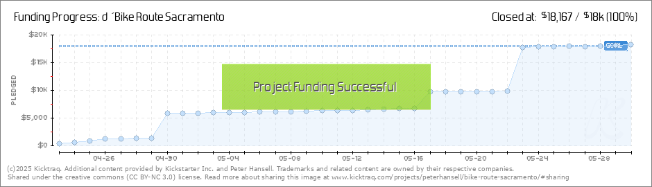 We are now 1/3 of the way towards making Bike Route Sacramento. AND We have our first Bike Route My town backer. I sure hope that this is the first of many additional towns that get Bike Route. (Read More)