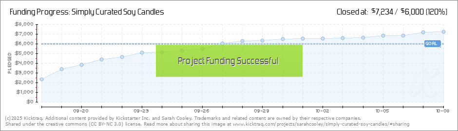 YOU GUYS ARE AWESOME! I'm amazed at the out pouring of support from friends, family, and strangers! We are now 72% funded in only 4 days! So we've added a new reward level: $225 for SIX candles. (That's $37.50 per candle including shipping!) We... (Read More)