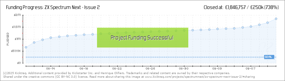 The ZX Spectrum Next Issue 2 has raised nearly £900,000 - far beyond its £250,000 goal - with 28 days of fundraising left to go. The Issue 2 is an updated version of an earlier ZX Spectrum Next, which was funded via Kickstarter in 2017. (Read More)