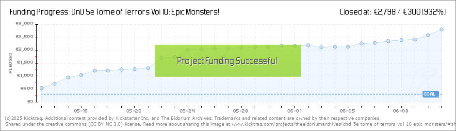 Hello! Stretch Goal #2 has been reached, so regardless of your tier, you will also receive an extra Epic monster with lore and statblock, bringing the total to four Epic monsters! As per usual, for every 1000€ gathered, another Epic monster will be... (Read More)