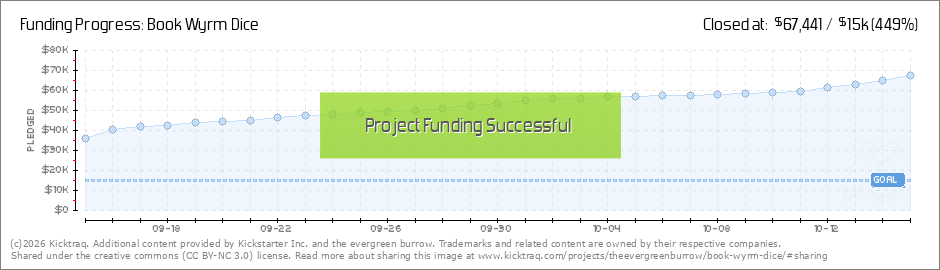 My darling Book Wyrms, We did it! All initial stretch goals have been UNLOCKED! You'll be able to choose between 8d6 and 7 piece polyhedral dice sets, and add any d6s you so choose in the Backerkit survey post-campaign. I have one last stretch goal... (Read More)