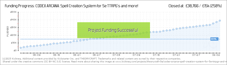 Evening All! This is fantastic! CODEX ARCANA is off to an amazing start in only the first 5-hours of our campaign, we can't wait to see just how big this project will become! CODEX ARCANA: Spell Creation System for 5e TTRPG's and more!Thanks to you... (Read More)