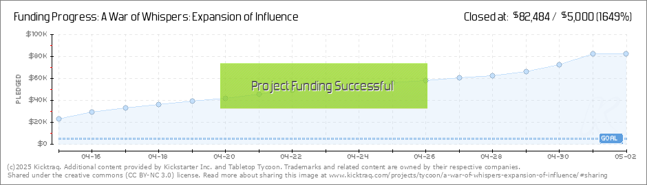 Wow! In just 30 minutes after launch, we’ve met our goal of $5,000 and are still flying by. Thank you so much to all of our backers so far. Whether this is your first foray into A War of Whispers or if you’ve been manipulating things from the... (Read More)