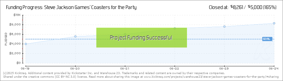 There you have it, we are officially fully funded! Thank you all so much for the support, not only here but on so many of our projects. Support on things like these coasters and our T-shirt campaign allow us to do some cool game-adjacent projects,... (Read More)