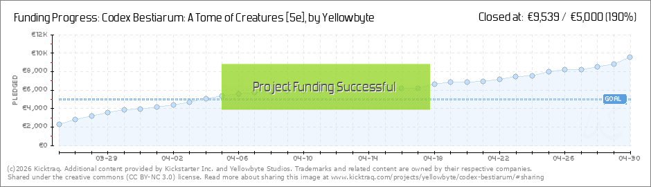 We are so happy that Codex Bestiarum got funded and we are now racing towards our 10.000€ stretch goal! Hopefullly we'll soon get there and add 10 more exciting creatures to the book!Also Notable CampaignForge your legacy in an immersive world... (Read More)