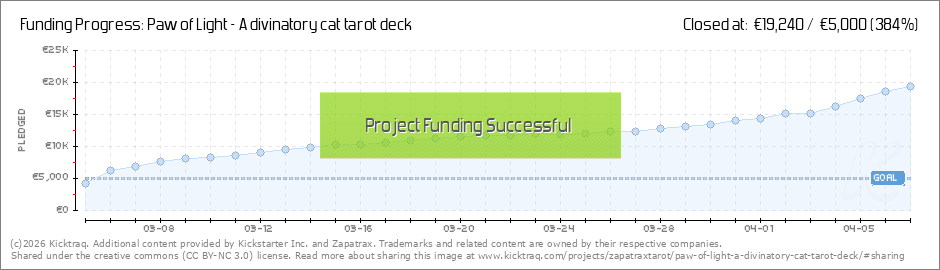 The second goal has just been unlocked: The pattern of the box will be in gold! The next goal to achieve is the much requested printed copy guide. Don't hesitate to share the campaign with loved ones who might like this tarot of little cats so... (Read More)