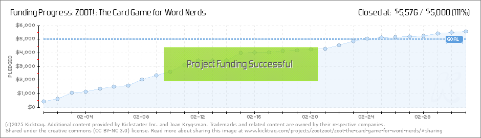 We did it! ZOOT! Goes to print tomorrow! Thank-you all - your belief in this project is overwhelming and absolutely friggin awesome. I cannot WAIT to play ZOOT! with each and every one of you. There is a road trip in my future, I just know it. So... (Read More)